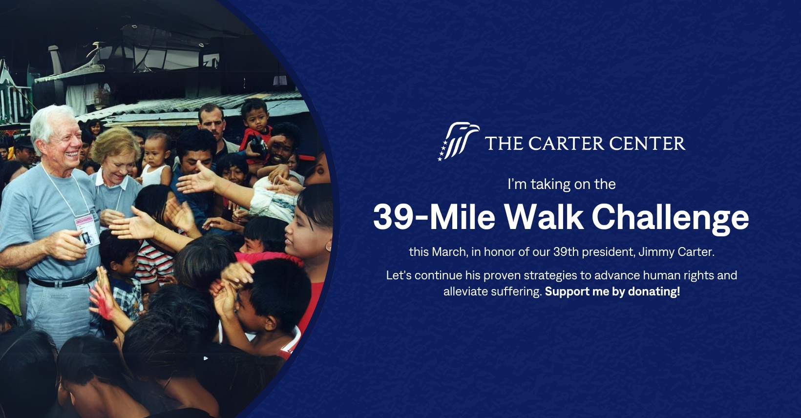 This March, I’m participating in the 39-Mile Walk Challenge to support the Carter Center’s ongoing mission. Each mile is a small tribute to the Carters’ belief that peace, health, and human dignity are not privileges but universal rights. Walking is a simple act, but it’s a way to honor a lifetime of service and help sustain the work that still lies ahead.