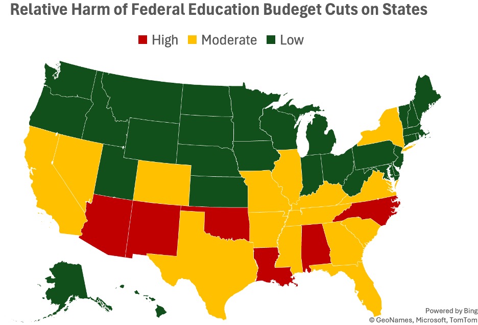 States with limited local revenue capacity were unable to backfill federal losses, leaving districts without viable alternatives. The brief notes that states with large high-need populations—including rural students, English learners, and students requiring special education—were the most vulnerable to both proposed cuts and administrative freezes. These patterns created a geographic concentration of harm in the Southwest and Deep South, where poverty rates, EL populations, and dependence on federal funding intersect.